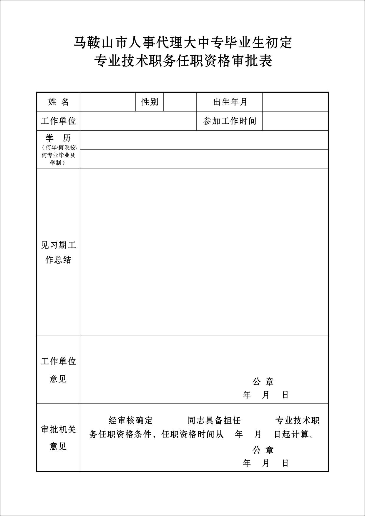 附件2:馬鞍山市人事代理大中專畢業(yè)生初定專業(yè)技術(shù)職務(wù)任職資格審批表